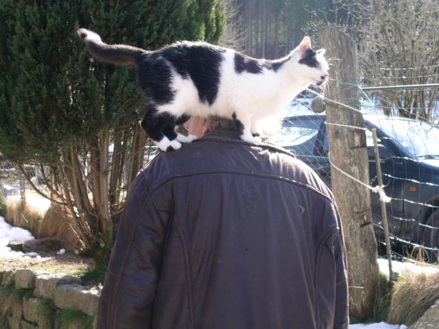 Sie erinnern sich, daß "Chocolat" als er uns gebracht wurde, dem Tod sehr nahe war. Munter macht er jetzt weite Spaziergänge mit mir und den Hunden und seine Vorliebe ist, den Menschen auf die Schulter zu springen. Am liebsten, wenn dieser es nicht erwartet. Dann muss er dringend die Haare und das Gesicht des Menschen bearbeiten, denn von unserer Frisur hat er gewisse eigene Vorstellungen. Dass er nur auf einem Auge sieht, scheint ihn nicht zu beeinträchtigen, denn seine Sprünge sind zielsicher!