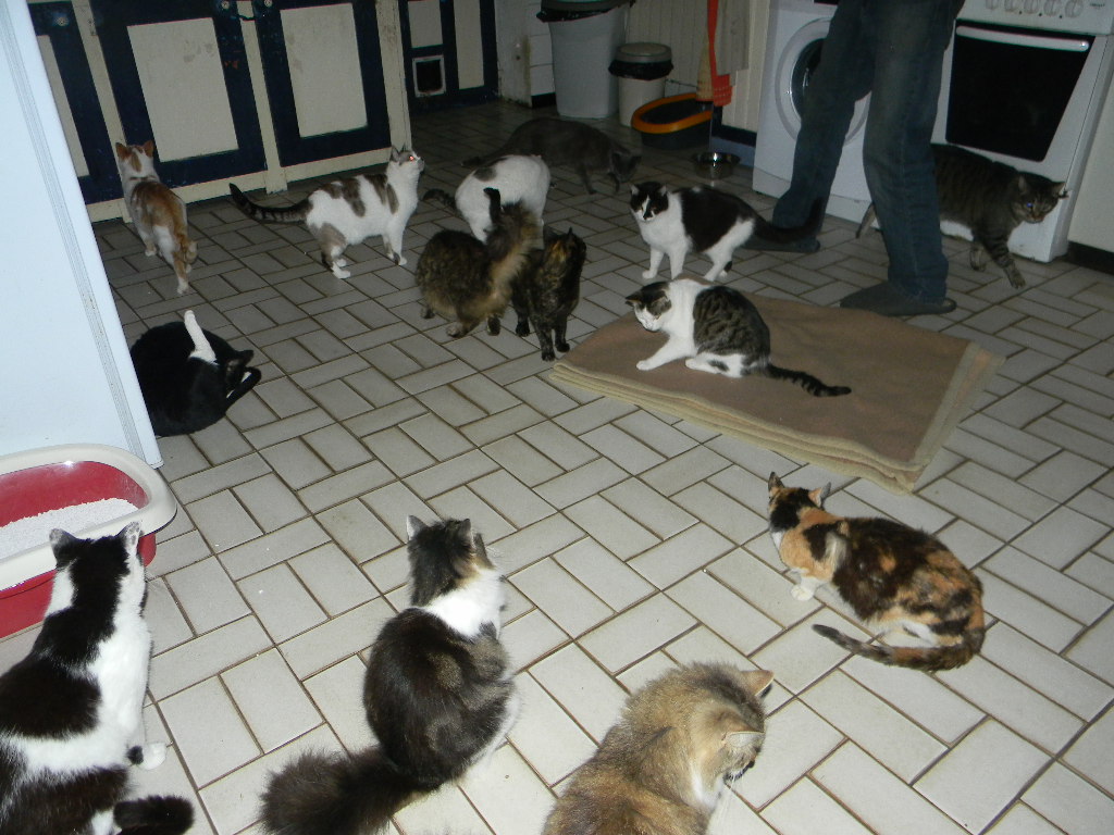und es gab schon die ersten Schneeflocken. Heute Morgen haben wir Holz gespalten, damit die Heizung laufen kann, denn 35 Katzen haben sich bereits ins Haus geschlichen und suchen warme Plätze. Die anderen verkriechen sich schon am späten Nachmittag in ihre Häuschen im Katzenhaus und Batiment. Da kommen die zwei gut isolierten Häuschen wunderbar zum Einsatz...