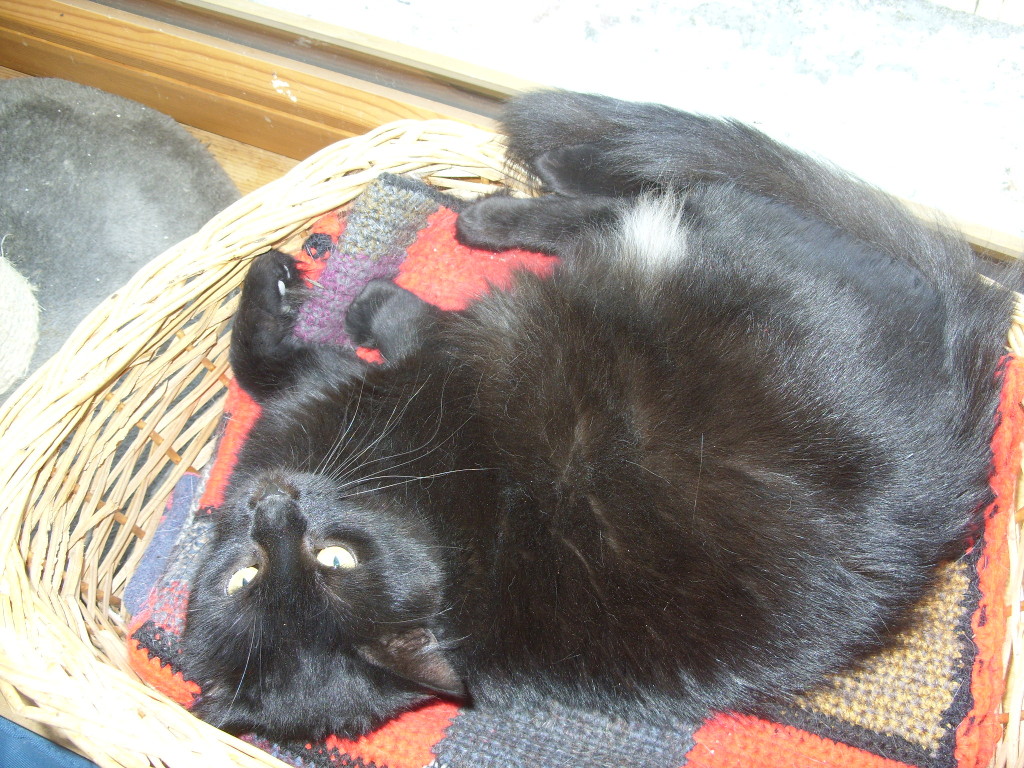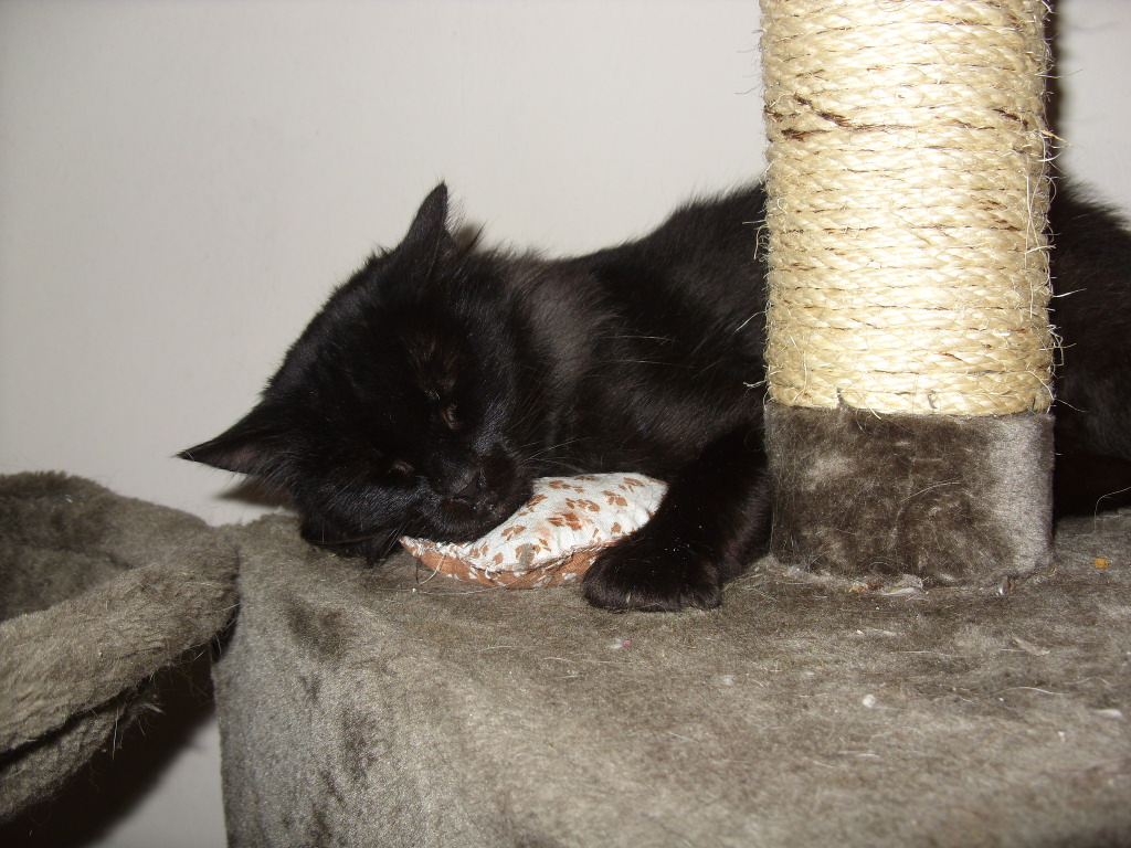 Emely musste eine traurige Zeit erleben. Nachdem ihr Frauchen verstorben war, lebte sie 1,5 Jahre ohne menschlichen Kontakt, eingesperrt in einem Zimmer. Niemand der Verwandten wollte sie übernehmen. So überließ man sie sich selbst und sperrte sie in dem verlassenen Haus in ein Zimmer. Ab und an wurde sie mit Futter und Wasser versorgt und das Katzenklo gereinigt. Als wir Emely übernahmen, hatte sie einen Hungerbauch, die Haut war ziemlich ausgetrocknet und sie war apathisch. Sie war vollkommen abwesend und erschien unbeweglich. Sie verließ ihren Platz auf dem Kratzbaum die ersten 6 Wochen nur bis zum Futternapf und der Katzentoilette. Es erschien, als würde sie die Welt um sich herum nicht wahrnehmen. Nur wenn sie gestreichelt wurde, entspannte sich ihr Körper ein wenig und man spürte, wie sie dies genoss und allmählich richtig süchtig danach erschien.