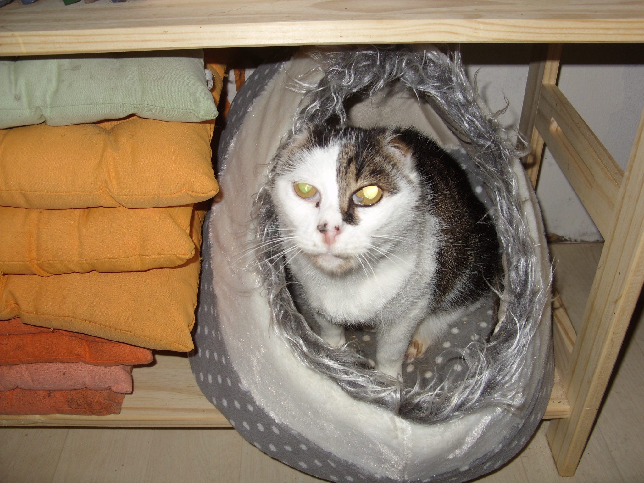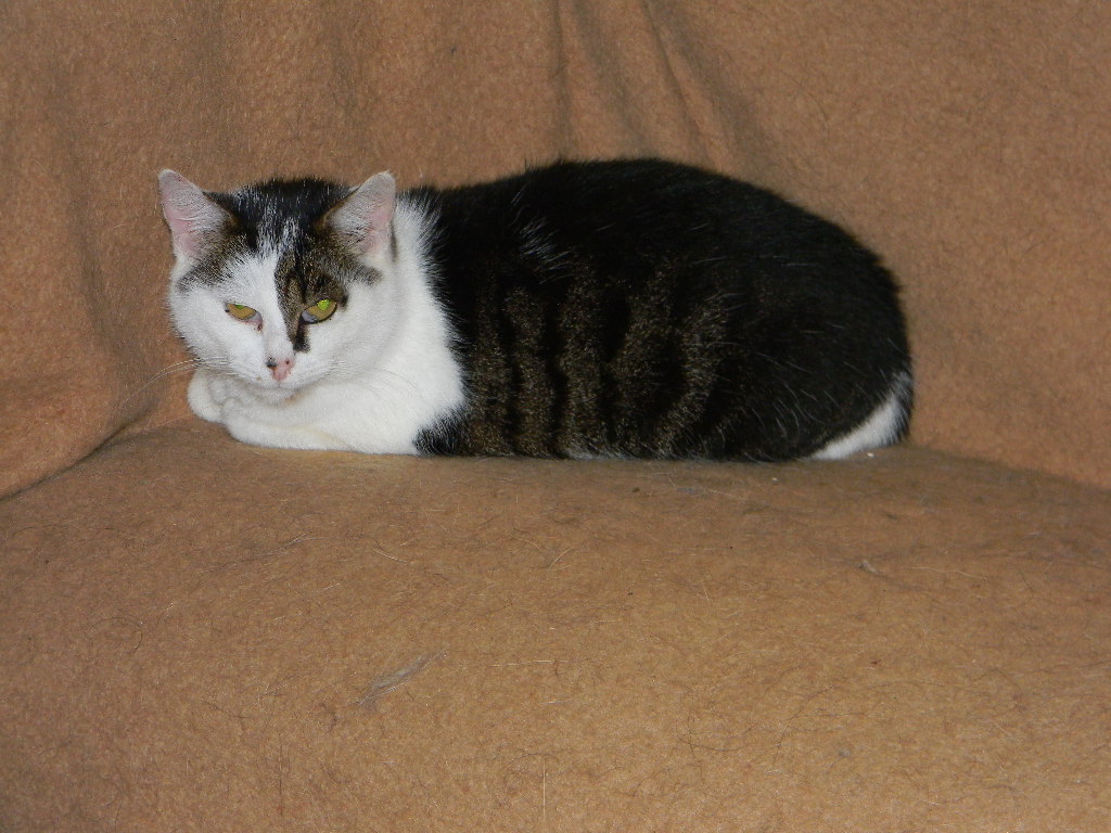 Auch wenn es riskant war, entschieden wir uns trotz ihres hohen Alters für die Operation, beide Ohren zu amputieren. Alle Versuche die Erkrankung medikamentös zu behandeln, half nicht. Die Ohren bluteten immer wieder und faulten buchstäblich ab. Inzwischen war Sony auch taub. Oft schrie sie nachts, wenn sie aufwachte: war es der Schmerz oder die ungewohnte überraschende Stille durch ihre Taubheit. Wir werden es nie erfahren, aber spürten die Verantwortung zu handeln. Trotz ihres hohen Alters überstand sie alles ohne Probleme. Als ich Sony in der Klinik abholte, musste ich schwer schlucken bei dem Anblick: eine Katze ohne Ohren. Sie bleibt jedoch unsere liebenswerte Sony. Wenn sie einen Wunsch hat, schreit sie überaus laut, da sie sich ja selbst nicht hört, uns aber auch nicht. Vielleicht darum schaut sie uns direkt in die Augen. Bei diesem Blick wollen wir ihr jeden Wunsch erfüllen. Ihr Lieblingsplatz bleibt der Sessel, eingerollt neben dem Menschen liegend.