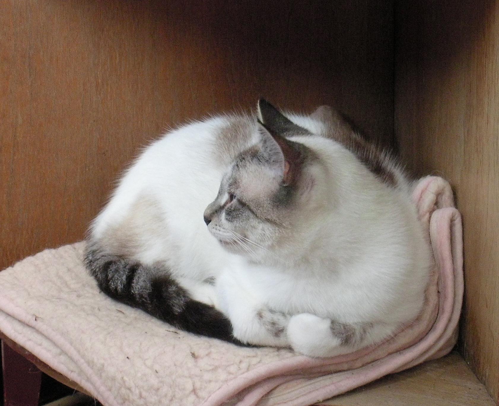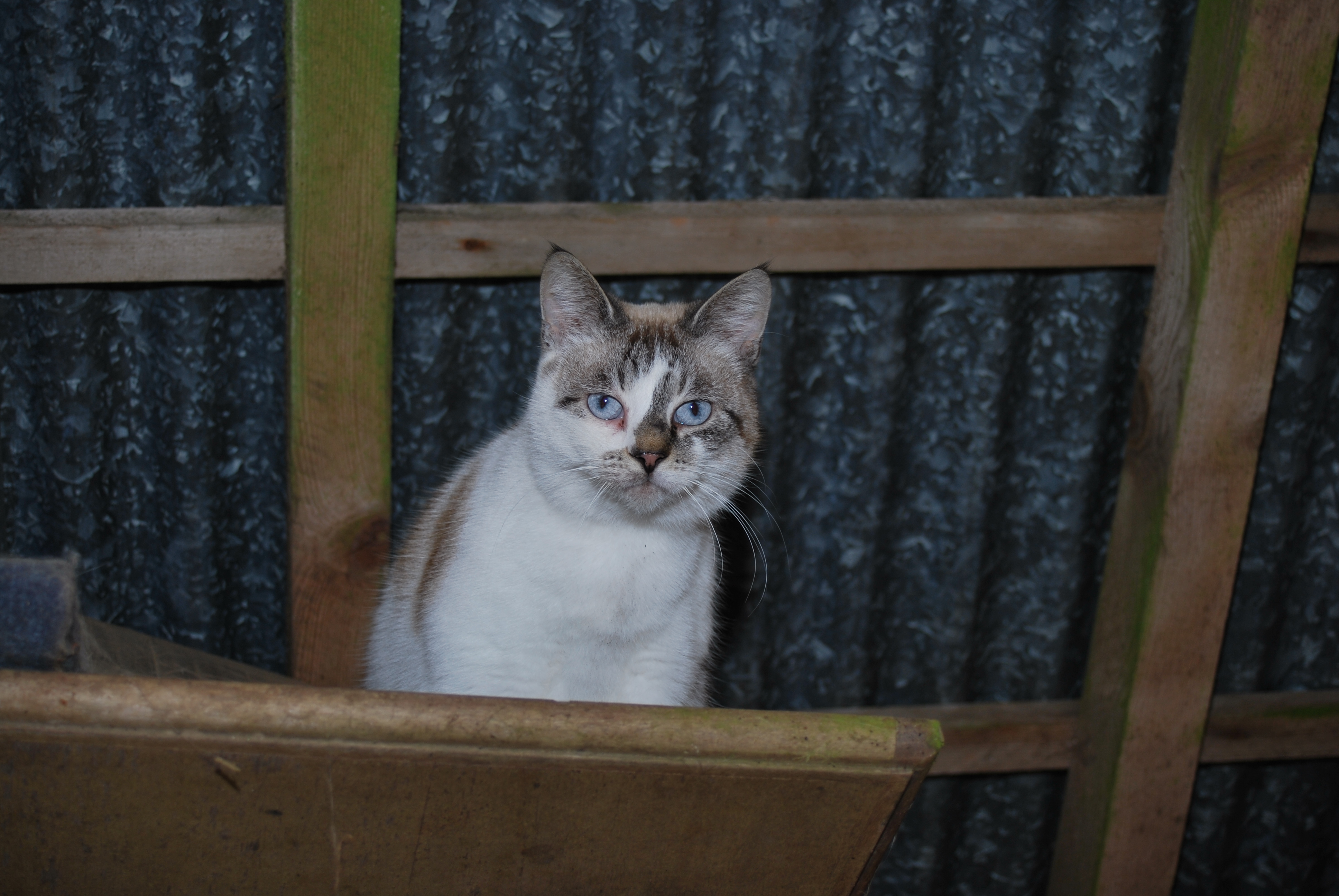 Sie ist die Schwester von Minou und ich habe bis zum heutigen Tag nur wenige Male geschafft, sie anfassen zu dürfen. Sie schaut mit ihren blauen Augen sehr zärtlich, aber der Abstand zum Menschen bleibt bei mindestens 40 Zentimetern. Sie ist keine Einzelgängerin und gut Freund mit ihren Artgenossen.