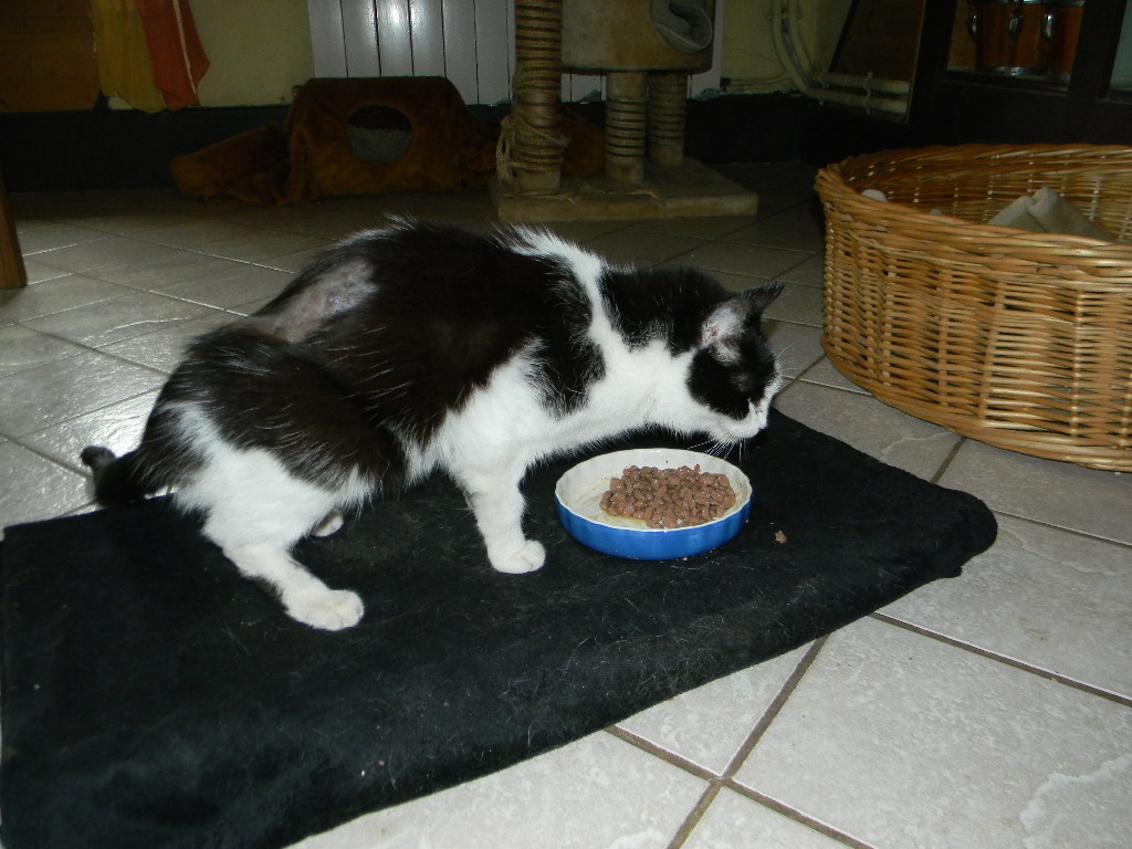 Als ich sie wieder abholen durfte, wurde mir die Einwirkung des Abzesses auf die Nervenbahnen erklärt und dass ein operativer Eingriff unumgänglich war. Sie wird einige Zeit brauchen, bis sich die Nerven wieder regeneriert haben und sie normal laufen kann. Aber Lilly hat einen starken Lebenswillen und Bewegungsdrang. Tapfer läuft sie durchs Haus, erzählt mit uns wie eh und je und ihre Technik sogar die Treppe zu begehen, war für uns bemerkenswert. Nichts hält sie auf, wenn sie zu ihrem Schlafplatz in der oberen Etage will. Nur das Hochspringen klappt noch nicht. Lautstark fordert sie ein, wann ihr Freßnapf auf den Boden gestellt werden muss und sie genüßlich schmatzend das Futter genießt. Natürlich muss eine weiche Decke unter ihr ausgebreitet werden, denn alles muss für sie "Stil" haben.
