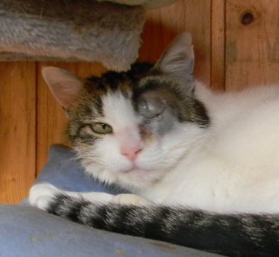 Als sie uns kam, hatte sie ein tränendes Auge und ein Mittel zur Behandlung wurde uns mitgegeben. Aber es trat keine Besserung ein, sondern verschlechterte sich bis zur starken Augenrötung mit eitriger Schleimbildung. Wir waren beunruhigt und der Gang zum Tierarzt war unvermeidbar. Dort fand man einen Fremdkörper im Augapfel, der nur vergrößert sichtbar wurde. Was tun? Die Entzündung war weit fortgeschritten und eine Entfernung dieses Fremdkörpers aus dem Auge war ohne weitere Verletzungen nicht möglich. Die Ärzte mußten das Auge entfernen.